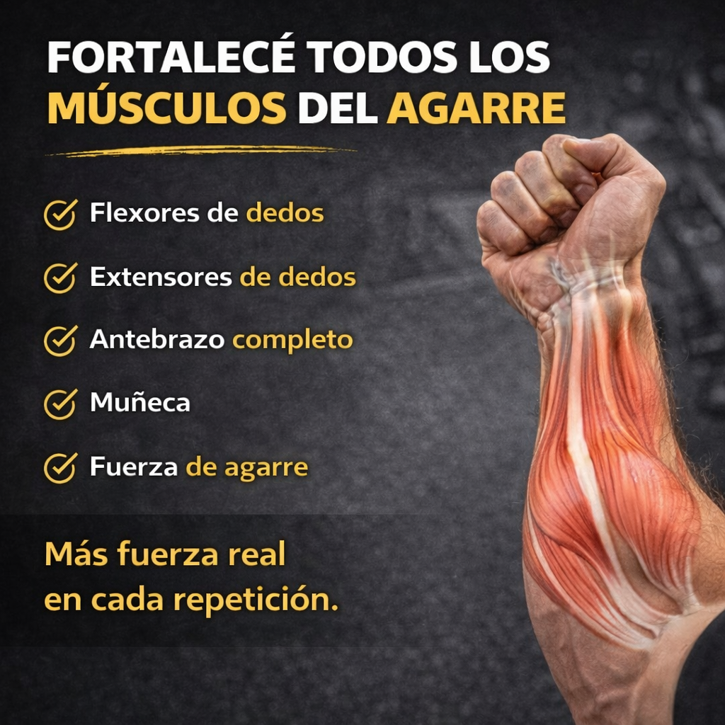 Ya sea que entrenes en el gimnasio, practiques deportes o simplemente quieras mejorar la fuerza de tus manos, este kit está diseñado para ayudarte a progresar de verdad.